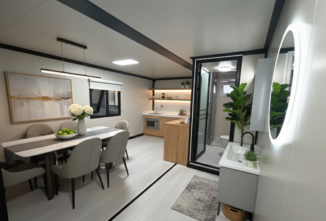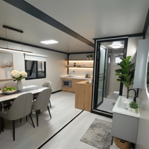 MOB CHERRY is a beautifully crafted 20FT expandable modular home, designed for those who appreciate warmth, elegance, and a modern natural aesthetic. Featuring a rich cherry wood–tone exterior with bold black accents, this model delivers a striking yet balanced look that blends perfectly with both urban and countryside environments — ideal for farm stays, backyard living, resorts, site offices, or rental units.