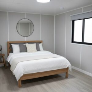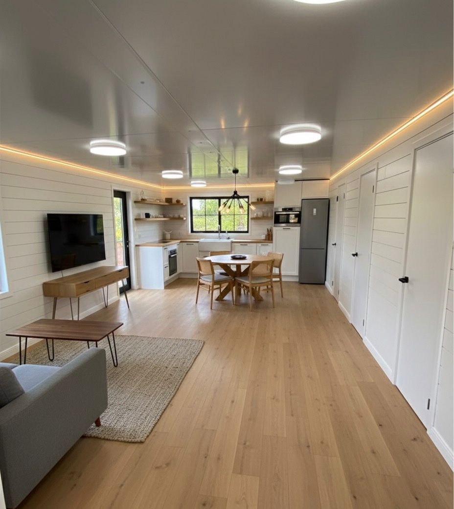 MOB IVORY is a beautifully designed 20FT expandable modular home built for customers who prefer a clean, minimal, and modern aesthetic. Featuring a stylish Ivory-white exterior with contrasting black framing, this model brings a calm and elegant look to any environment — perfect for backyard living, farm stays, resorts, offices, and rental spaces.
