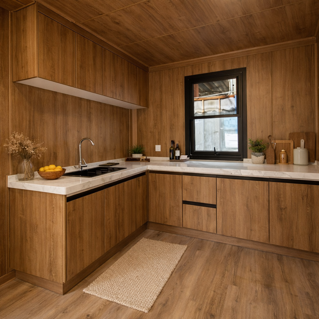 Pre-installed electrical, plumbing, flooring, ceiling, and fixtures