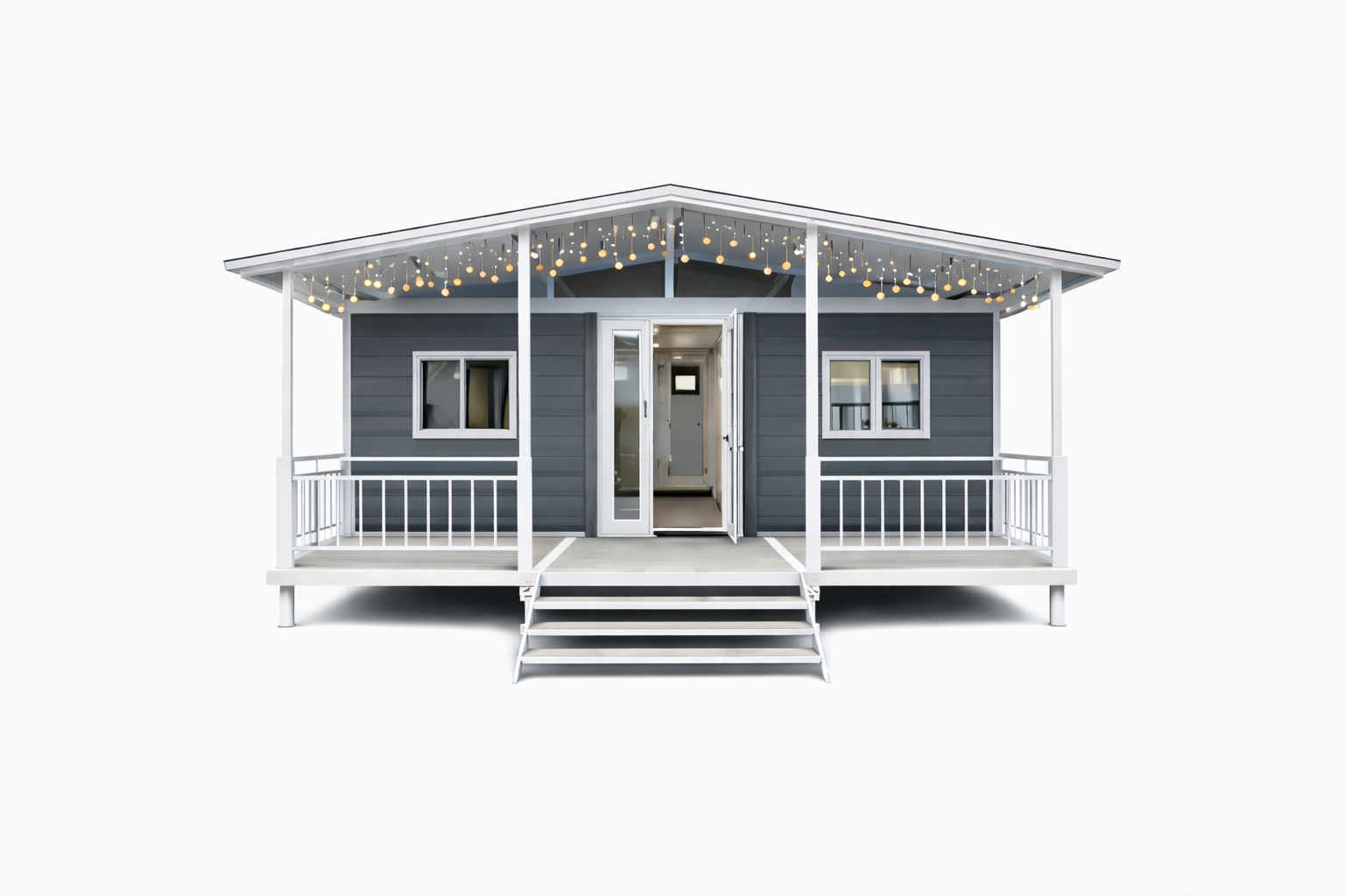 PORCH SLATE is a 40FT expandable modular home designed for use as an accessory dwelling unit (ADU) or residential structure, subject to local zoning approval. It features an grey exterior with white structural framing, a covered front white porch, and a central glazed entry consistent with U.S. residential design norms.